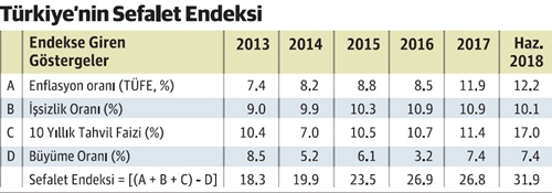 Türkiye’de sefalet endeksi son 5.5 yılda artış eğilimi içinde görünüyor. 2013 yılında 18.3 olan endeks bugün itibariyle 31.9’a gelmiş olduğuna göre son 5,5 yılda Türkiye’de sefalet endeksi ikiye katlanmış bulunuyor.