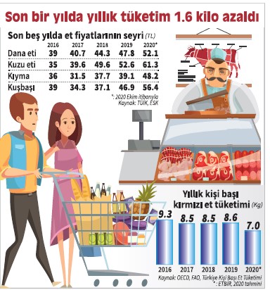 Kırmızı Et Sanayicileri ve Üreticileri Birliği’nin (ETBİR) tahmini tüketim verilerine göre, yıllık kişi başı kırmızı et tüketimi 2019’da 8.6 kilo iken 2020’de 7 kiloya düştü. ETBİR Yönetim Kurulu Başkanı Ahmet Yücesan, “Bu yıl kırmızı et tüketiminde toplamda yüzde 30 daralma var. Tüketimin yüzde 15-20’si turizm sektöründen geliyordu. Turizmin ağır etkilenmesiyle gelir sağlayamadık. Bunun dışında tesislerin, toplu yemekhanelerin ve restoranların kapanmasıyla, çalışsalar da yüzde 20 kapasiteyle çalışmalarıyla buradaki tüketimi de kaybettik. Pandemi olmasaydı kişi başı tüketimin 8.6 kiloda, 2019 ile aynı kalmasını öngörüyorduk. Ancak bu da sert düştü” dedi.