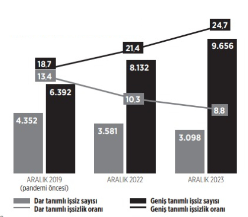 Ekonomiyi yavaşlatma hamleleri işgücüne yansıdı. Geniş tanımlı işsizlik oranı yüzde 24,7’ye yükseldi. İşsiz sayısı bir ayda 1 milyon kişi artarak 9,7 milyon kişiye ulaştı. TÜİK ise işsiz sayısını 3 milyon olarak açıkladı.