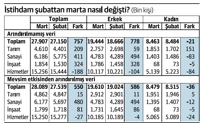 -İstihdam martta mevsim etkisinden arındırılmış hesaplamaya göre 550 bin arttı. Arındırmaya konu olmayan hesaplamaya göre artış ise 757 bin düzeyinde.