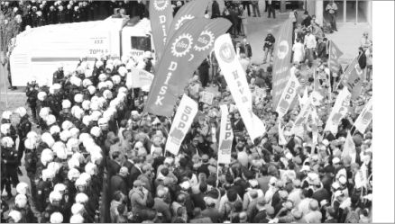 Türk-İş içerisindeki muhalif 10 sendikanın oluşturduğu Sendikal Güç Birliği Platformu (SGBP), sabah saatlerinde Türk-İş önünde toplandı. Türk-İş’in tasarı karşısında sessiz kalmasına tepki gösteren işçiler, “Türk-İş uyuma, üyene, onuruna sahip çık; Hükümet yasanı al başına çal” sloganları attı, “Vesayetçi ve yasakçı sendikalar yasası istemiyoruz” yazılı pankart açtı. Türk-İş Başkanı’na da tepki gösteren işçiler “Mustafa Kumlu istifa” sloganları da attı. SGBP dönem sözcüsü, TÜMTİS Genel Başkanı Kenan Öztürk, tasarı ile sendikal hak ve özgürlüklerin 12 Eylül hukukunun dahi gerisine götürülmek istendiğini söyledi. Tasarının yasalaşması halinde 7 sektörde örgütlü sendikaların tamamının baraj altında kalacaklarını dile getiren Öztürk, “Yüzde 1 barajıyla 10 sendika, yüzde 2 barajıyla 13 sendika, yüzde 3 barajıyla 6 sendika baraj altında kalacaktır” dedi. Öztürk, “Türk-İş ve Hak-İş’i tasarıyla ilgili düşüncelerini kamuoyuna açıklamaya davet ediyor, işçi sınıfından, sendikal hak ve özgürlüklerden yana mı, yoksa iktidara ‘kulluk’tan yana mı saf tutacaklarını belirlemelerini istiyoruz” diye konuştu.