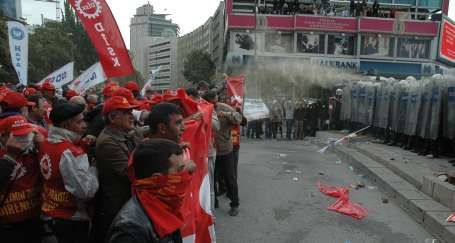 Meclis’in karşısında Akay Yokuşu girişine adeta yığınak yapan polis, yürümekte ısrar eden işçi ve sendikacılara gaz bombası ve biber gazı ile müdahale etti. Atılan gaz bombaları ve biber gazından çok sayıda kişi etkilendi, fenalaşanlar ambulanslarla hastanelere kaldırıldı.