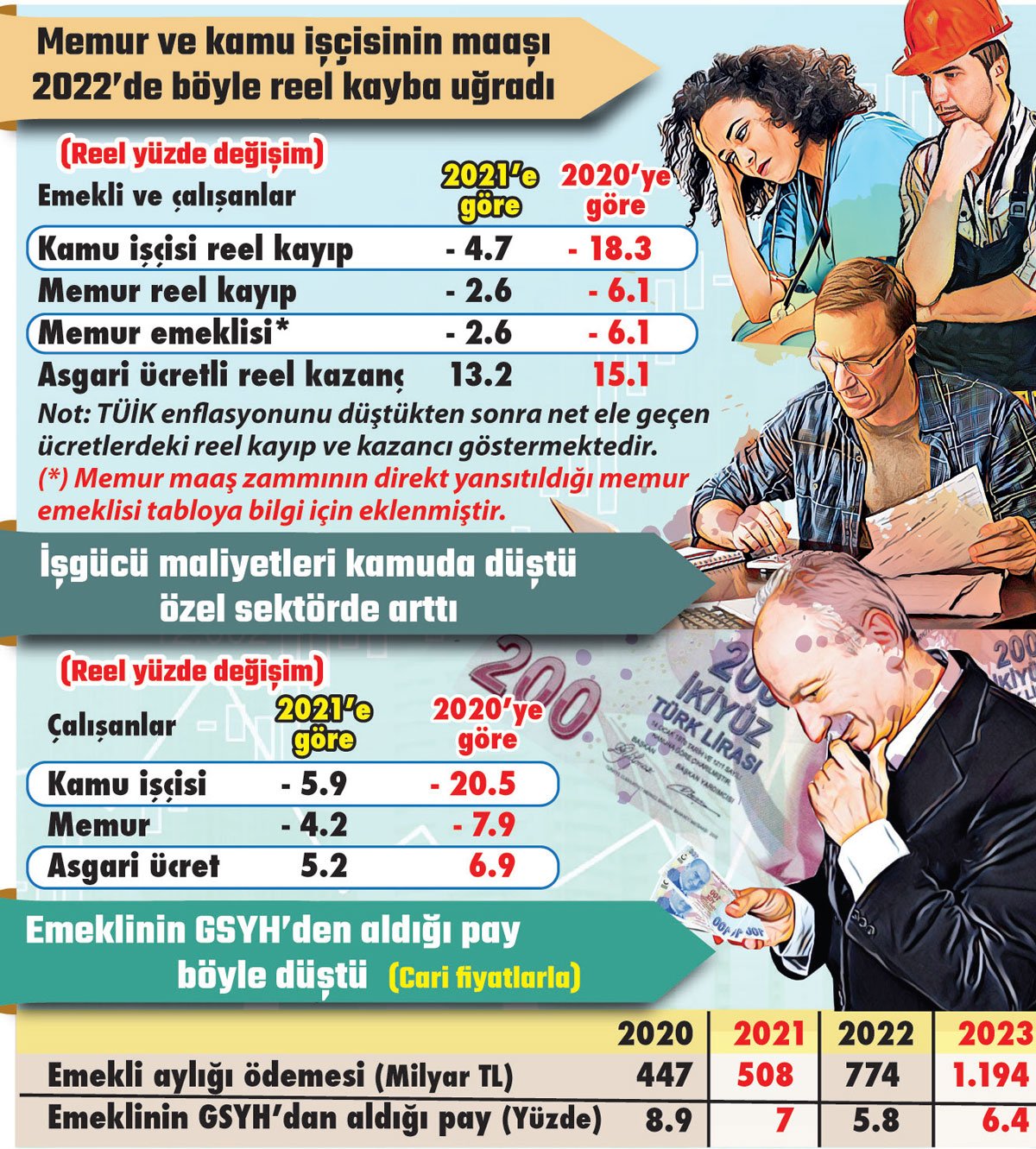 Açıklanan 2023 programında memur ve memur emeklilerinin bir yılda yüzde 2.6, iki yılda yüzde 6.1 oranında reel ücret kaybına uğradığı görüldü.