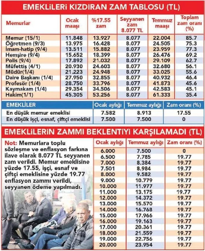 Temmuzdan geçerli olmak üzere tüm memur maaşlarına toplu sözleşme ve enflasyon farkına ilave olarak 8 bin 77’er lira seyyanen zam yapan iktidar 16 milyonu aşkın memur, işçi, esnaf ve çiftçi emeklisini Türkiye İstatistik Kurumu’nun (TÜİK) açıkladığı ve gerçek hayat pahalılığım yansıtmayan enflasyon artışıyla baş başa bıraktı. Adaletsiz zam nedeniyle en düşük memura 1 Temmuz’dan geçerli olarak yüzde 85.7 oranında zam yapılırken memur emeklisine yüzde 17.55, işçi, esnaf ve çiftçi emeklilerine yüzde 19.77’lik zamla yetinildi.
