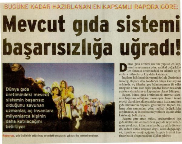 BUGÜNE KADAR HAZIRLANAN EN KAPSAMLI RAPORA GÖRE: Mevcut gıda sistemi başarısızlığa uğradı! Dünya gıda üretimi üzerine yapılan en kapsamlı araştırmaya göre, radikal değişiklikler olmazsa önümüzdeki on yıllarda aç insanlara milyonlarca kişi daha katılacak. İngiltere hükümetinin yaptırdığı Gıda Üretiminin Geleceği Raporu dün Londra’da dünya kamuoyuna açıklandı. 35 ülkeden 400 biliminsanının iki yıllık emeğinin ürünü olan rapor şimdiye kadar bu alanda yapılan çalışmaların en kapsamlısı olarak biliniyor. Rapor, dünya gıda üretimindeki mevcut sistemin başarısız olduğunu savunuyor.