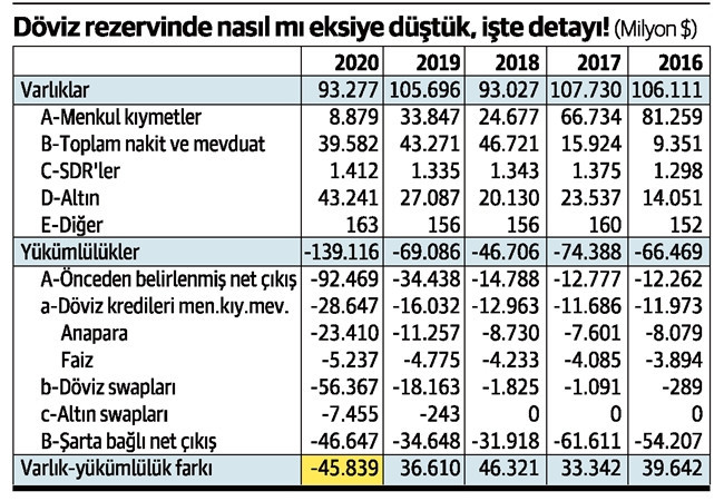 Bakıyorum tabloya; 2020 sonu itibarıyla varlık-yükümlülük farkı, yükümlülüklere swap da dahil edilmiş halde negatif 46 milyar dolar.