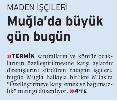 Termik santralların ve kömür ocaklarının özelleştirilmesine karşı aylardır direnişlerini sürdüren Yatağan işçileri, bugün Muğla halkıyla birlikte Milas’ta "Özelleştirmeye karşı emek ve bağımsızlık" mitingi düzenliyor. Emek örgütlerinin de destek vereceği mitinge geniş katılım bekleniyor. Yatağan işçileri, özelleştirmelere, talan ve yolsuzluk düzenine tepkili olan tüm yurttaşlara mitinge katılım çağrısı yaptı.
