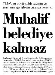 TBMM İçişleri Komisyonu’nda görüşülmekte olan ve büyükşehir belediyelerinin sınırlarını genişleten, sayılarını artıran yasa tasarısı, tümüyle AKP’nin değirmenine su taşıyacak. Toplumsal Ekonomik Siyasal Araştırmalar Vakfı’nın (TESAV) 2011 milletvekili genel seçimleri sonuçlarına göre yaptığı araştırmasına göre, yeni kurulucaklar dahil 29 büyükşehir belediyesinin 23’ünü AKP, 4’ünü CHP, 2’sini BDP alacak. TESAV’ın çalışması, 2012 yılında yapılacak büyükşehir belediye seçimlerinde yeni tasarının öngördüğü hükümler uygulanırsa, şu andaki 16 büyükşehir belediyesinde AKP’den muhalefete geçecek hiçbir belediyenin bulunmadığı ortaya çıktı.