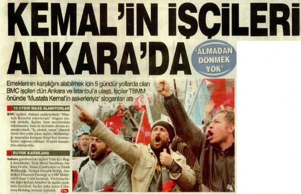 Emeklerinin karşılığını alabilmek için 5 gündür yollarda olan BMC işçileri dün Ankara ve İstanbul’a ulaştı. İşçiler TBMM önünde ‘Mustafa Kemal’in askerleriyiz’ sloganları attı. BMC işçileri, Ankara caddelerinde "Mustafa Kemalin askerleriyiz" sloganı atarak yürüdü. İşçiler, hem ücretlerinin ödenmesini, hem de üretimin devam etmesini istedi. "îş, ekmek, vatan" diyerek izmir’den yolla çıkan işçiler, Mehmetçiği mayından koruyan Kirpi’leri üretmelerine rağmen yaklaşık 10 aydır maaşlarını alamıyordu.