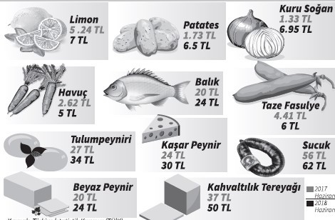 Öte yandan, patatesin bir yıllık fiyat artışı yüzde 300’leri aşmış durumda. Geçen ay 3 TL’ye bir kilo patates alınabiliyorken, bu ay bu para ancak yarım kilo patatese yetiyor. Patatesin fiyatı bir ayda 3 TL’den 6.5 TL’ye çıkarken, soğandaki aylık fiyat artışı 4 lirayı buldu. Buna göre geçen ay kilosu 3 TL olan kuru soğan, bu ay 6.95 TL’ye yükseldi. 2017 Haziran’ında 4.41 TL olan taze fasulye fiyatı ise, bu Haziran’da 6 TL’yi buldu. Ancak fiyat artışları yalnızca bu ürünlerle sınırlı değil. Gıda ürünlerindeki zammı limon ve havuç fiyatları izliyor. Havucun kilosu son bir ayda 2 liradan 5 liraya çıkarken, yıla 4.40 TL’den başlayan limon mayısta 5.5 TL’ye, haziranda 7-8 TL’ye kadar yükseldi. Kuru soğandaki fiyat artışının sebepleri arasında üreticinin geçen yıl beklediği fiyatı bulamayınca üretim alanını azaltması ve bir kısmının da tarlasını kiraya vermesi yer alıyor. Diğer yandan bu yıl görülen sağanak yağışlar üretimi olumsuz etkiledi. Bu faktörler maliyetleri yükseltti. Patateste de meterololojik olumsuzluklar nedeniyle yüzde 1 düşüş bekleniyor. TMMOB Ziraat Mühendisleri Odası İstanbul Şube Başkanı Ahmet Atalık, “Fiyat artışı bekleyen bir kısım tüccar ürünü piyasaya sürmediği için kuru soğan ve patates fiyatları uçtu” dedi.