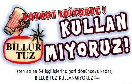 Halkların Demokratik Kongresi (HDK) İzmir bileşenlerinin çağrısı böyle. Sebebi ise Billur Tuz’un sendikaya üye olan 54 işçiyi işten çıkarmış olması. HDK adına açıklama yapan Ceren Kocataş, Türkiye’nin tuz pazarının yüzde 80’ini elinde tuttuğunu belirterek, Billur Tuz’u boykot çağrısı yaptı.