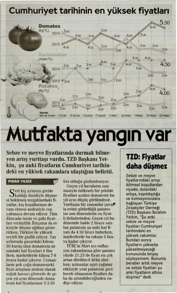 Sebze ve meyve fiyatlarındaki artışı iklimsel koşullardan ziyade; dolardaki artışa, kayıtdışılığa ve komisyonculara bağlayan Türkiye Ziraatçiler Derneği (TZD) Başkanı İbrahim Yetkin, "Şu anki sebze ve meyve fiyatları Cumhuriyet tarihindeki en yüksek rakamlar. Bundan sonra fiyatların yükselip yükselmeyeceği konusunda birşey söyleyemem. Bununla beraber artık meyve ve sebze fiyatları şu anki fiyatların altına düşmez" dedi.