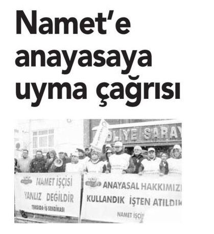 Açıklamayı Tek Gıda-iş Sendikası Örgütlenme Sorumlusu Yunus Durdu yaptı. Durdu, "Biz barıştan yanayız, bu bacanın tütmesini isteriz, işçi yoksa üretim araçlarınız bir işe yaramaz" dedi. "Namet işçisi köle değildir" sözleriyle konuşmasını sürdüren Durdu, Tek Gıda-iş’in Namet’e girerek, kölelik düzenine son vereceğini söyledi. Aydınlık’a konuşan işçiler, Namet’te 1214 saat arasında zorunlu çalıştıklarını, kadınların 50 kilo yük kaldırmak zorunda bırakıldığını, itiraz edenlerin işten çıkarılmakla tehdit edildiğini ifade etti.