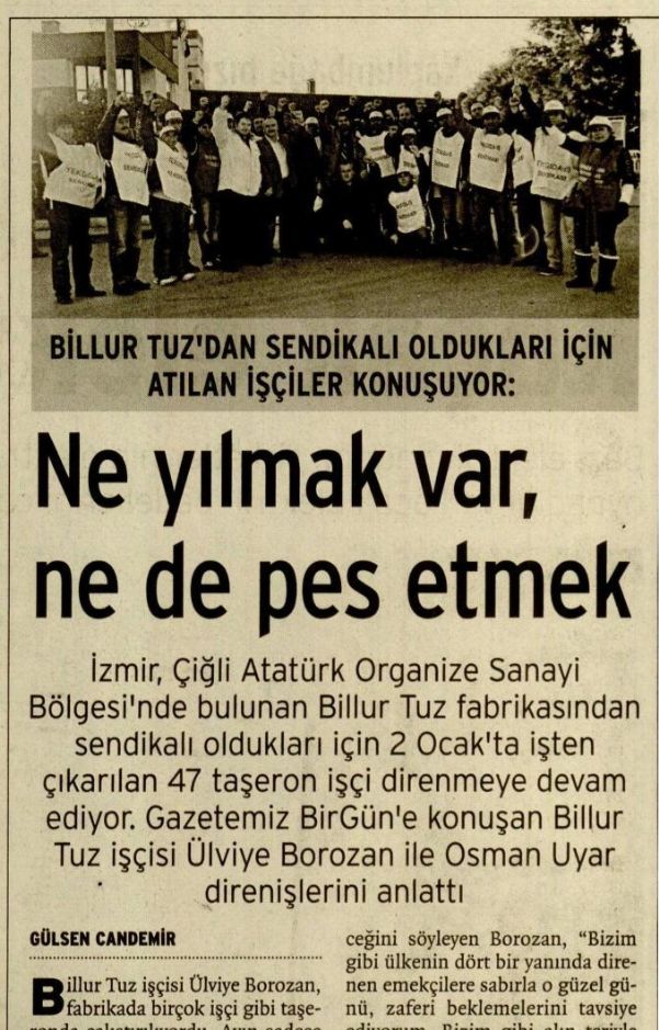 BİLLUR TUZ´DAN SENDİKALI OLDUKLARI İÇİN ATILAN İŞÇİLER KONUŞUYOR: İzmir, Çiğli Atatürk Organize Sanayi Bölgesi´nde bulunan Billur Tuz fabrikasından sendikalı oldukları için 2 Ocak´ta işten çıkarılan 47 taşeron işçi direnmeye devam ediyor. Gazetemiz BirGün´e konuşan Billur Tuz işçisi Ulviye Borozan ile Osman Uyar direnişlerini anlattı