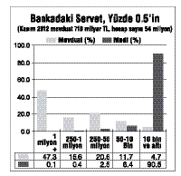 BBDK verilerine göre, Kasım 2012’de bankalarda (gerçek ve ticari) 54 milyon hesap cüzdanı var. 74 milyon nüfusa 54 milyon cüzdan, başta kulağa hoş geliyor. Ama kazın ayağı başka. Bu hesap cüzdanlarında, yüzde 62’si gerçek kişilere ait olmak üzere 718 milyar TL mevduat var. Bunların binde 1’i (yani yaklaşık 50 bin cüzdan) mevduatın neredeyse yarısına (yüzde 47.3’üne) sahip. Cüzdanların binde 5’ine, ya da yüzde 0.5’ine (yarımına) bakınca mevduatların yüzde 63’üne, yani neredeyse üçte ikisine sahip olduklarını görüyorsunuz. Yuvarlak hesapla, 300 bin hesapta 467 milyar TL var. Neredeyse her hesapta 1.5 milyar TL!..