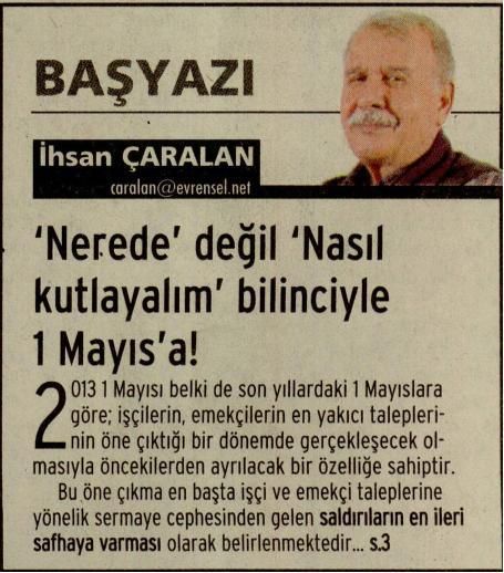 2013 1 Mayısı belki de son yıllardaki 1 Mayıslara göre; işçilerin, emekçilerin en yakıcı taleplerinin öne çıktığı bir dönemde gerçekleşecek olmasıyla öncekilerden ayrılacak bir özelliğe sahiptir.?
