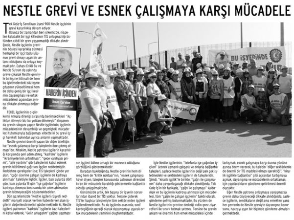 Günümüzde artık, tek başına bir işyerin sorunlarından ibaret bir TİS yoktur. Tersine giderek TİS’ler başlıca talepleriyle tüm sektörlerden işçileri ilgilendirmektedir. Bu da işçilerin arasında, sınıf kardeşliğinin gereği olarak dayanışmayı aşarak ortak mücadelenin zeminini oluşturmaktadır. işte Nestle işçilerinin, "telefonla işe çağırılan işçileri" (esnek zamanlı çalışan) ve onlarla bağlantılı talepleri, sadece Nestle işçilerinin değil pek çok işletmedeki ve sektördeki işçilerin de talepleridir. Şimdi, "kiralık işçilik’le birikte, "çağrı ile çalışmanın" daha yaygınlaşacağı dikkate alındığında, Tek Gıda-iş’in bir farikada, "çağrı ile çalışmayı" kaldırmak ve bu işçilerin kadroya alınması için mücadelesi, tüm "çağrı ile çalışan işçilerin" talebi olarak, gündeme gelmiş bulunmaktadır. Bu yüzden de Nestle işçiierinin grevine desteği, rutin grev ziyaretleri ile sınırlı tutmak yetmez. Tersine bu grevin anlam ve önemini tüm emek mücadelesi içinde tartışmak, esnek çalışmaya karşı durma yönüne ayrıca önem vererek, bu talebin "diğer sektörlerde de önemli bir TİS maddesi olması gerektiği", "kiralık işçilikle bağlantısı" gibi açılardan tartışmaya açmak, dayanışma ve mücadelenin ortaklaması için yapılacakların gündeme getirilmesi önemli olacaktır.