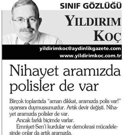 Birçok toplantıda "aman dikkat, aramızda polis var!" uyansını duymuşsunuzdur. Artık devir değişti. Nihayet aramızda polisler de var. Ancak farklı biçimde varlar. Emniyet-Sen’i kurdular ve demokrasi mücadelesinde onlar da artık aramızda. Belki onlar da toplantilannda önce ”aman dikkat, aramızda polis var" uyansını yapacaklar.