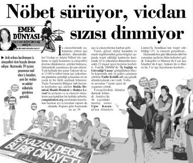 Ardı arkası kesilmeyen iş cinayetleri tüm hızıyla devam ediyor. Haziranda 59 işçinin yaşamına mal olan iş kazaları, yeni bir vicdan ve adelet nöbetiyle gündeme getirildi.