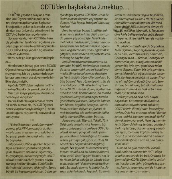 "18 Aralık’tan beri yorduğun yetmiyormuş gibi NTV’de yaptığın açıklamayla onca sınavımın arasında bana bu yazıyı yazdırdın ya aşk olsun sana be başbakan! Biliyorum ODTÜ’ye gelirken hayal ettiğin karşılama gördüklerin gibi değildi. Biliyorum isterdin ki öğrencisiyle, çalışanıyla, akademisyeniyle ODTÜ olarak etrafında el ele çember oluşturup hep birlikte "Beraber Yürüdük Biz Bu Yollarda" şarkısını söyleyelim.