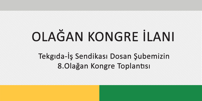 Tekgıda-İş Sendikası Dosan Şubemizin 8.Olağan Kongre Toplantısı, 6356 Sayılı Yasa gereğince, 16 EKİM 2021 Cumartesi günü Saat:13.00-17.00 arasında Karadeniz Caddesi No: 9 Pazar / RİZE adresindeki MİNERVA OTEL Konferans Salonunda aşağıdaki gündeme göre yapılacaktır.