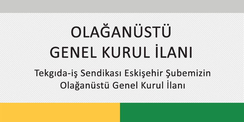 Sendikamız Eskişehir Şubesinin Türk Medeni Kanunu’nun 84. maddesinin 2. fıkrası uyarınca 01.10.2020 tarihinde arasında Şeker Mah. Sivrihisar 1. Cad. No.119 Tepebaşı/ESKİŞEHİR adresinde bulunan Reyna Premium Hotelde Olağanüstü Genel Kurulu yapılacaktır.