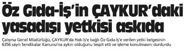Çalışma Genel Müdürlüğü, ÇAYKUR´da Hak-İş´e bağlı Öz Gıda-lş´e verilen yetki belgesinin 6356 sayılı Sendikalar Kanunu´na aykırı olduğunu tespit etti ve işleme konulmasını durdurdu