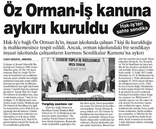 Sahte sendika Hak-İş´e bağlı Öz Orman-İş´in, inşaat işkolunda çalışan 7 kişi ile kurulduğu iş mahkemesince tespit edildi. Ancak, orman işkolundaki bir sendikayı inşaat işkolunda çalışanların kurması Sendikalar Kanunu´na aykırı.