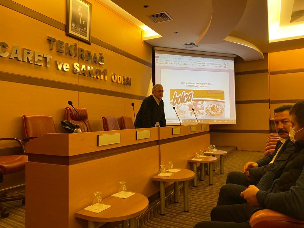 Toplu İş Sözleşmesinde yer alan Eğitim maddesi gereği işverenlikle birlikte planlanan taban üye eğitimini Tekirdağ Sanayii ve Ticaret Odası Konferans Salonunda, 3 grup halinde gerçekleştirdik. Endüstriyel İlişkiler ve Çalışma Yasaları eğitimini ODTÜ Öğretim Görevlisi Yıldırım Koç verdi. Genel Eğitim Sekreterimiz Kemal Köse, sendikamızın genel politikaları ve sendikal örgütlülüğün önemini anlattı. Tekirdağ Şube Başkanımız Aytaç Göçmen de işyeri ile ilgili sorunlara ve ilişkilere yönelik bilgilendirmelerde bulundu.