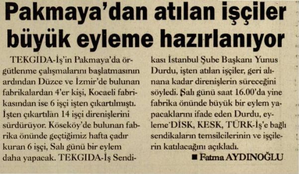 TEKGIDA-İş´in Pakmaya´da örgütlenme çalışmalarını başlatmasının ardından Düzce ve İzmir´de bulunan fabrikalardan 4´er kişi, Kocaeli fabrikasından ise 6 işçi işten çıkartılmıştı. İşten çıkartılan 14 işçi direnişlerini sürdürüyor.