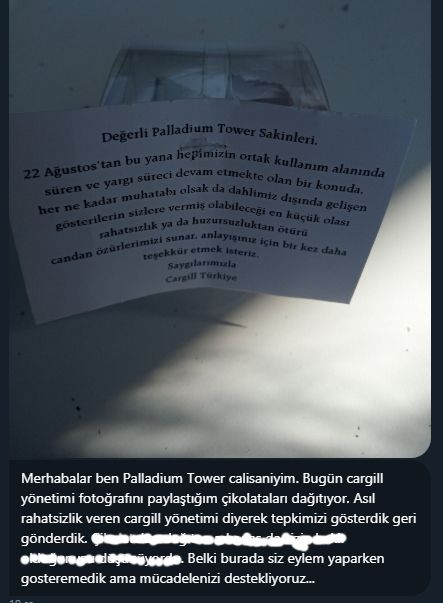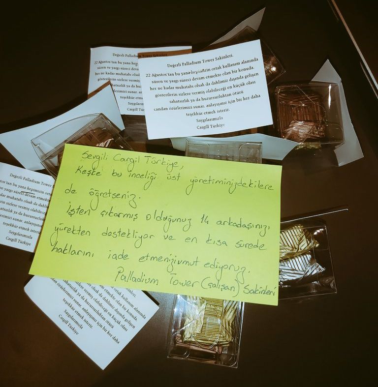 1 Ekim’de İstanbul direnişimizi noktalayıp, fabrika önüne döndükten sonra Cargill yönetiminin sizlere çikolata dağıtarak gösterdiği çirkin tavra, çikolataları yazdığınız notlarla iade etmeniz dayanışmaya ve insana inancımızı arttırdı. Palladium emekçileri olarak verdiğiniz onurlu yanıt bizler için paha biçilemez bir destek ve moral oldu, göğsümüz kabardı! Oysa bu hukuksuzluğu yapanlar, bir parça çikolatayla gerçeğin üstünü örtebileceğini, vicdanları susturabileceğini sanıyorlardı.
