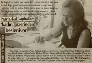 Aslında mücadele patriarkal (ataerkil) kapitalizme karşı olmalı. Yani erkek egemen zihniyetle tasarlanan kapitalist sisteme karşı duruş sergilenmediği zaman başarı şansı da olmuyor. Kapitalizm, işçi ve işveren ilişkileri ve emek sömürüsü üzerinden bir artı değer yaratırken kadının üzerinden de erkeğin konfor sağladığı ve bir tür ezilme ilişkisi haline gelen bir sistem doğuruyor. Biz bu yüzden patriarkal kapitalizm tanımını koyuyoruz. Evdeki kadının rolü işgücünün sürdürülebilirliği açısından önemli. Şöyle ki kadın alışverişi yapıyor hatta nerede neyin fiyatı uygun araştırarak alıyor, yemeği pişiriyor, çocuklarının kocasının bakımını yapıyor, konforunu sağlıyor. Benim araştırma konum olan tersanelerdeki bekâr erkek işçiler ev ortamı olmaksızın ne kadar dayanabilirler? Sadece kısa bir süre…