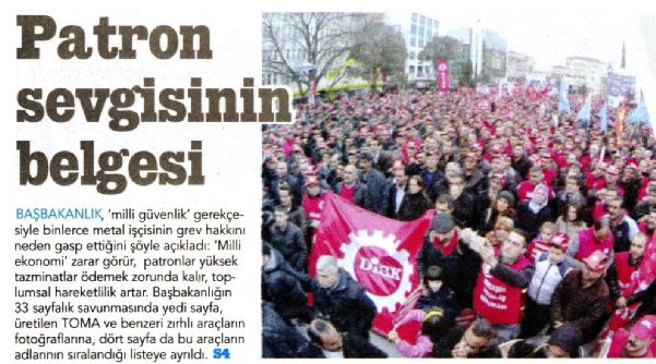 BAŞBAKANLIK, ´milli güvenlik´ gerekçesiyle binlerce metal işçisinin grev hakkını neden gasp ettiğini şöyle açıkladı: ´Milli ekonomi´ zarar görür, patronlar yüksek tazminatlar ödemek zorunda kalır, toplumsal hareketlilik artar. Başbakanlığın 33 sayfalık savunmasında yedi sayfa, üretilen TOMA ve benzeri zırhlı araçların fotoğraflarına, dört sayfa da bu araçların adlarının sıralandığı listeye ayrıldı.