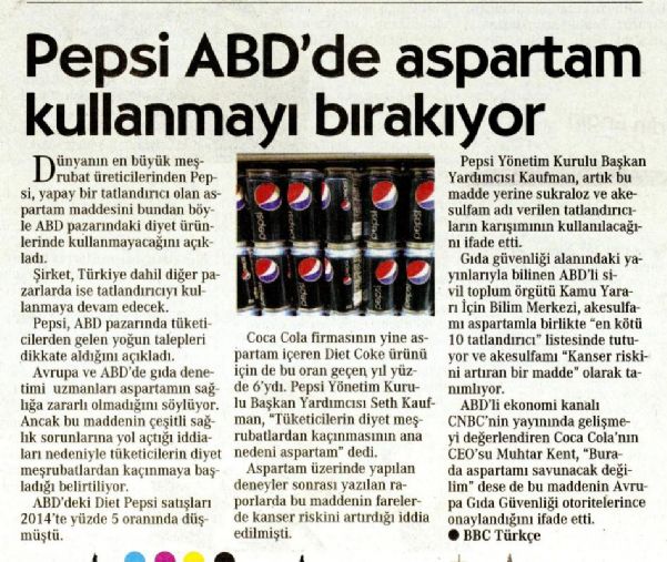 Şirket, Türkiye dahil diğer pazarlarda ise tatlandırıcıyı kullanmaya devam edecek. Pepsi, ABD pazarında tüketicilerden gelen yoğun talepleri dikkate aldığını açıkladı. Avrupa ve ABD’de gıda denetimi uzmanları aspartamın sağlığa zararlı olmadığını söylüyor. Ancak bu maddenin çeşitli sağlık sorunlarına yol açtığı iddiaları nedeniyle tüketicilerin diyet meşrubatlardan kaçınmaya başladığı belirtiliyor.