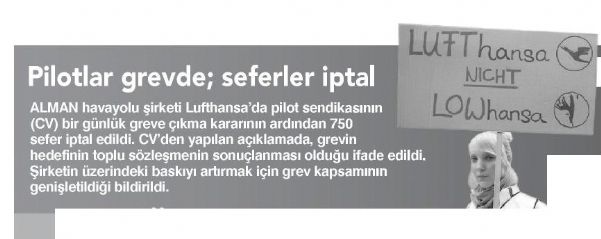 ALMAN havayolu şirketi Lufthansa’da pilot sendikasının (CV) bir günlük greve çıkma kararının ardından 750 sefer iptal edildi.