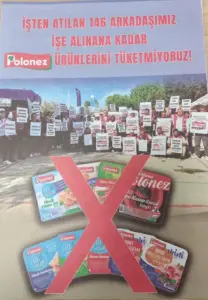 Geçtiğimiz hafta işçiler ve sendika temsilcileri, hem İstanbul Valiliği hem de Çalışma Bakanı Vedat Işıkhan ile Ankara’da bir toplantı gerçekleştirdi. İşveren, işçilere kıdem ve ihbar tazminatları ile geriye dönük alacaklarını ödemeyi teklif ederek fabrika önündeki direnişin sonlandırılmasını talep etti. Ancak işçiler, “Fabrikamıza sendikamızla dönmek istiyoruz” diyerek bu teklifi kabul etmedi. Vatan Partisi Genel Başkanı Doğu Perinçek’in başlattığı Polonez ürünlerine boykot çağrısı, diğer siyasi partiler ve sendikaların desteğiyle büyümeye devam ediyor.  İzmir’de de sürdürülen boykot kampanyasının işçilerin haklarını alana kadar devam edeceğini belirten Tekgıda-İş Sendikası İzmir 3 No’lu Şube Başkanı Latif Gökçay, Tekgıda-İş Sendikası İzmir 7 No’lu Şube Başkanı Latif Atabey ve Manisa Şube Başkanı Yavuz Uçkıran ile beraberindeki sendika üyeleri, İzmir’in her sokağını kapı kapı gezerek, vatandaşları boykota davet ediyor. Ömer Atabey, “Ürdün’lü işveren, İstanbul Çatalca’da faaliyet gösteriyor. Trakya Et ve Süt Ürünleri adı altında yer alan Polonez marka ürünleri üreten, 146 işçiyi anayasal haklarını kullandıkları için işten çıkardı. Şu anda yapmak istediğimiz şey işçilerin yeniden işe alınması ve anayasal haklara saygı gösterilmesi. Kendisi de yabancı sermaye olduğu için devlet tarafından da korunuyor. Henüz bir aşama kaydedemedik ancak fabrika önünde ve yurt genelinde eylemlerimiz, işçiler haklarını alana kadar devam edecek” dedi.