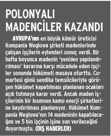AVRUPA’nın en büyük kömür üreticisi Kompania Weglowa şirketi madenlerinde çalışan işçilerin eylemleri sonuç verdi.
