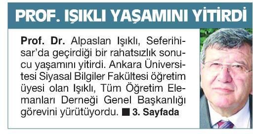 Prof. Dr. Alpaslan Işıklı, Seferihisar´da geçirdiği bir rahatsızlık sonucu yaşamını yitirdi. Ankara Üniversitesi Siyasal Bilgiler Fakültesi öğretim üyesi olan Işıklı, Tüm Öğretim Elemanları Derneği Genel Başkanlığı görevini yürütüyordu.