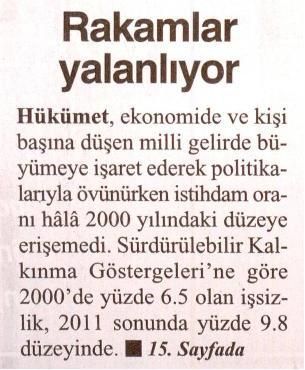 İşsizlik, AKP’nin pembe tablosunu yalanladı. Hükümet, ekonomide ve kişi başına düsen milli gelirde büyümeye işaret ederek politikalarıyla övünürken toplam istihdam oranı hâlâ 2000 yılındaki düzeye erişemedi. ? Sürdürülebilir Kalkınma Göstergeleri’ne göre 2000’de yüzde 6.5 olan işsizlik oranı, 2011 sonunda yüzde 9.8 düzeyi ile 3.3 puan daha yüksek oldu.