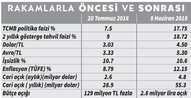 Cumhurbaşkanı, OHAL döneminde sık sık faize karşı olduğunu söylese de, 20 Temmuz 2016’da yüzde 7.5 olan Merkez Bankası (TCMB) politika faizi, önceki gün yüzde 17.75’e yükseldi. OHAL döneminde faizde artış 1025 baz puanı buldu. 20 Temmuz 2016’da yüzde 9 olan 2 yıllık gösterge tahvil faizi, dün yüzde 18.72’ye kadar yükseldi. Bu rakam, Aralık 2008’den bu yana kaydedilen en yüksek rakam oldu. Vatandaşın, şirketlerin ve devletin borçlanma maliyetleri katlandı. faiz maliyeti, 100 milyar lirayı aştı.