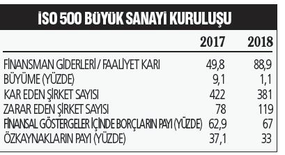 İlk 500 sanayi şirketinin büyüme oranı 2017 yılında yüzde 9.1 iken 2018 yılında yüzde 1.1’e geriledi. Aslında 2018 yılında tüm sanayi sektöründe büyüme eğilimi düşmeye başlamış ve son çeyrekte yüzde 0.1 olmuştu. 2019 ilk çeyreğinde küçülme olacaktır.