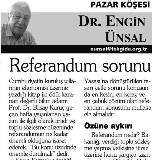 Cumhuriyetin kuruluş yıllarının ekonomisi üzerine yazdığı kitap ile ödül kazanan değerli bilim adamı Prof. Dr. Bilsay Kuruç geçen hafta yayınlanan yazım ile ilgili olarak aradı ve toplu sözleşme düzeninde referandumun ne kadar önemli olduğuna işaret ederek, "Bu konu üzerinde önemle durulmalı" dedi.