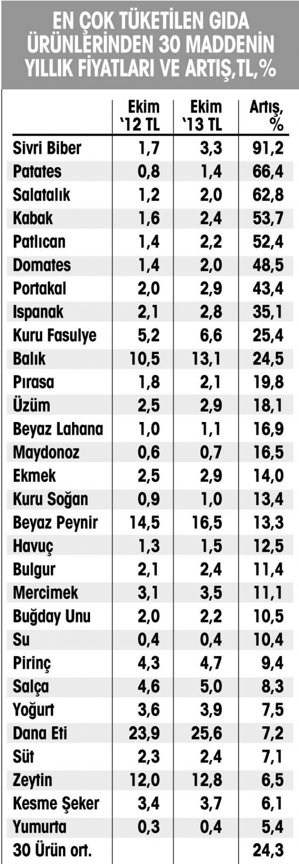 Yeniden gıda fiyatlarına dönersek; Ekim’den Ekim’e fiyatı tavan yapmış ürünleri sebzeler oluşturuyor. Biber, patates, kabak, patlıcan, domateste fiyatlar 2012 ekim ayına göre yüzde 90 ile yüzde 50 arasında artmış. Mesela; ortalama domates fiyatı 1,4 TL’den 2 TL olmuş. Bazılarınız, nerede 2 TL’ye domates, diye itiraz da edebilir tabii ki… Ortalama balığın fiyatının 10 TL’den 13 TL’ye çıktığını belirtiyor TÜİK. Dana etindeki artışın yüzde 7,2 ile daha insaflı olduğunu ve ortalama kilosunun 26 TL olduğunu belirlemiş. Öyle ya da böyle; her ailenin öncelikle satın aldığı bu 30 maddedeki fiyat artışı yıllık yüzde 24!… 134 maddelik ortalama artış da yüzde 11,6.