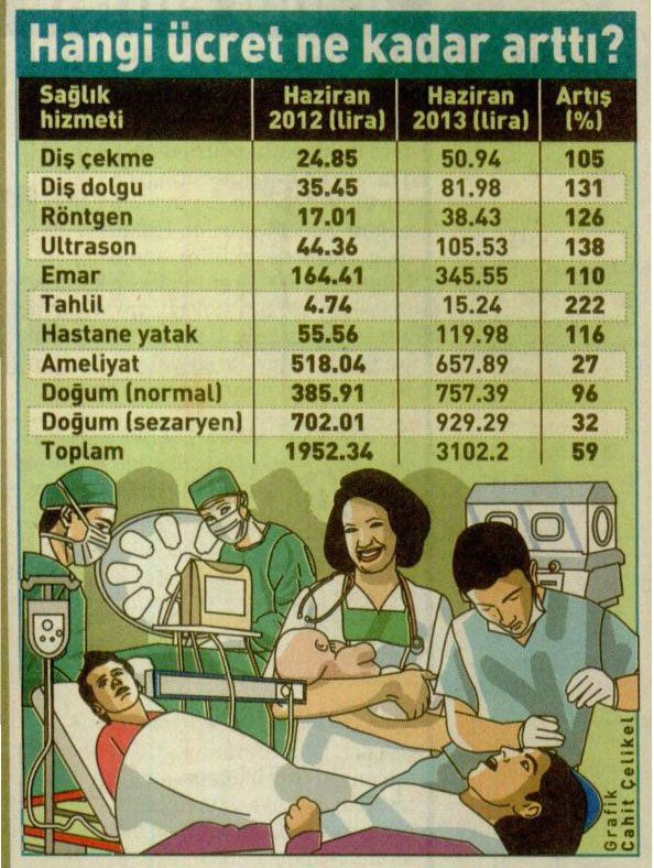 Türkiye istatistik Kurumu (TÜÎK) verilerine göre; sağlık hizmetlerinde en yüksek fiyat artışı yüzde 222 ile laboratuvar tahlili, yüzde 138 ile ultrason, yüzde 131 ile diş dolgusunda gerçekleşti.