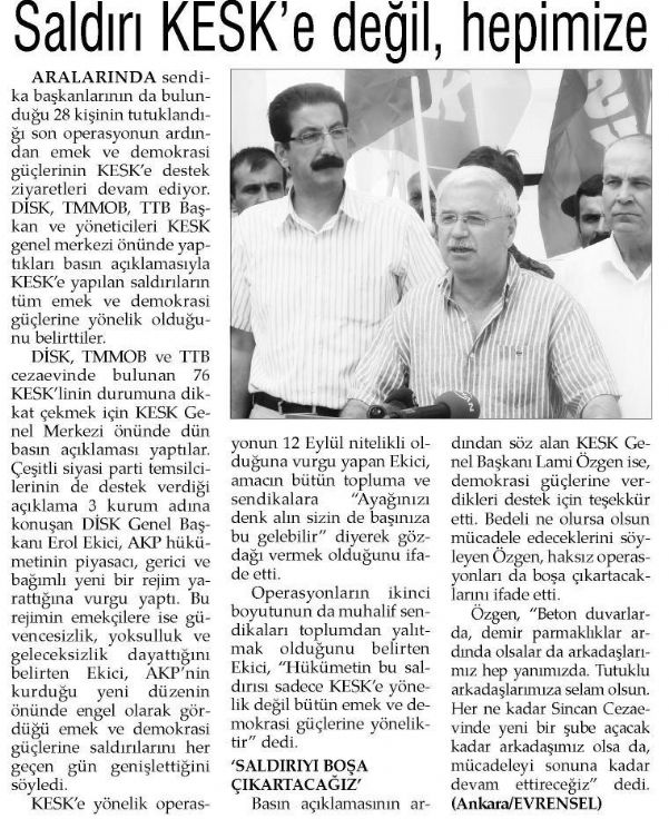 DİSK, TMMOB ve TTB cezaevinde bulunan 76 KESK’linin durumuna dikkat çekmek için KESK Genel Merkezi önünde dün basın açıklaması yaptılar. Çeşitli siyasi parti temsilcilerinin de destek verdiği açıklama 3 kurum adına konuşan DİSK Genel Başkanı Erol Ekici, AKP hükümetinin piyasacı, gerici ve bağımlı yeni bir rejim yarattığına vurgu yaptı.