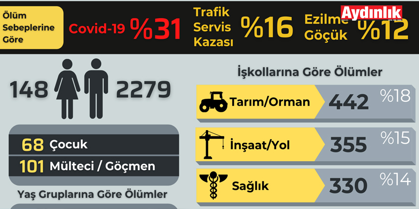 2020 yılında iş kazanlarında ölenlerin 109’u (yüzde 4.49) sendikalı işçi, 2 bin 318’i ise (yüzde 95,51) sendikasız. Sendikalı işçiler tarım, gıda, madencilik, kimya, tekstil, iletişim, büro, eğitim, ticaret, cam, metal, inşaat, enerji, taşımacılık, sağlık, güvenlik ve belediye işkollarında çalışıyordu. Diğer yandan ölen başka sendikalı işçiler de olabilir. Ancak kâğıt üzerinde olan sendikal üyeliklerinin gerçek bir örgütlülük olmaması ve birçok sendikanın ölen üyelerini sahiplenmemesi sonucu net bir bilgi alma şansı yok. Diğer yandan inşaatlarda, fabrikalarda, tarlalarda ve bürolarda yüksekten düşen, ezilen, göçük altında kalan, trafikte yollara savrulan, fazla çalışmadan kalp krizi geçiren, işsizlik nedeniyle hayatına son veren bin 686 işçi de vefat etti. Kovid-19 ölümlü iş kazaları sayısını yüzde 30 artırdı.