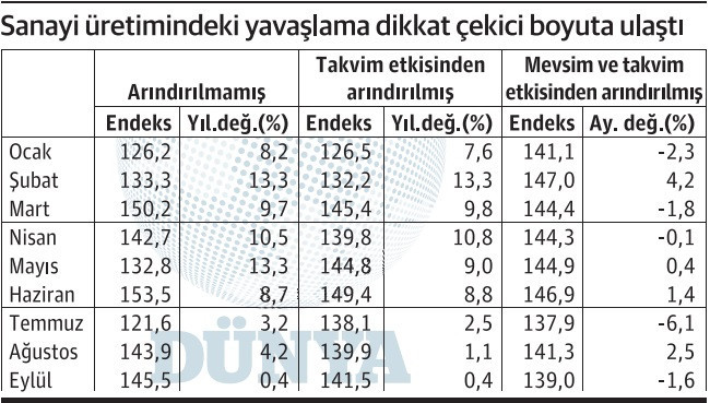 Üstelik mevsim ve takvim etkisinden arındırılmış endeks bu yıl iki kez 140’ın altına indi; bunlardan biri temmuz, diğeri de eylül ayı. Dolayısıyla üçüncü çeyrek üretimindeki sıkıntı çok derinleşmiş durumda ve aylık endeks değişimindeki gidişatla da kendini gösteriyor.