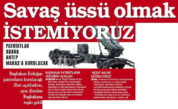 Başbakan Erdoğan’ın önceki gün katıldığı televizyon programında patriotların Adana, Gaziantep ve Kahramanmaraş’a yerleştirileceğini açıkladı. Adana’da bulunan insan haklan savunucuları, emek örgütleri emekçiye ayrılması gereken bütçenin savaşa ayrılmasına karşı olduklarını ve Adana’nm savaşın değil barışın simgesi olması gerektiğini belirttiler.
