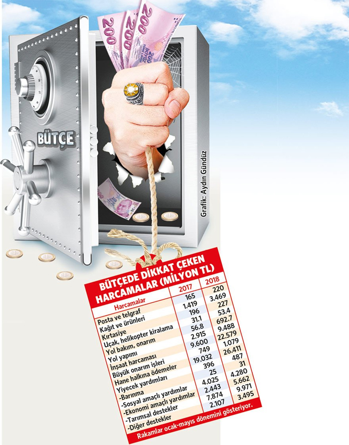 MALİye Bakanlığı’nın açıkladığı 2018 yılı Ocak-Mayıs bütçe gerçekleşme verileri, hükümetin erken seçime çok önceden karar verip bütçe harcamalarını seçime göre dizayn ettiği izlenimi veriyor. Hükümet aynı şekilde ani bir kararla geçen yılın sonuna doğru taşeron işçilerin kadroya alınması sürecini başlatmış, bu sürpriz karar, erken seçim sinyali olarak algılanmıştı. Seçim öncesi, posta ve telgraf giderleriyle kağıt harcamalarındaki artış da dikkat çekti. Bu yılın ilk 5 ayında bütçeden posta ve telgrafa yapılan harcama, geçen yılın aynı dönemine göre yüzde 33.3 artarak 165 milyon liradan 220 milyon liraya çıktı. Aynı dönemde devlet yaklaşık 3.5 milyar liralık kağıt ve kağıt ürünü satın aldı. Geçen yıl ilk 5 ayda 1.4 milyarlık kağıt devlete yetmişti. İlk 5 ayda özel sektörden kiralanan uçaklar için yapılan ödeme de 53.4 milyon lirayı buldu.