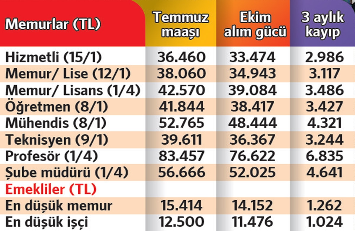 Temmuzda 2 bin 500 lira ara zam yapılan en düşük emekli aylığı da 3 ay önce 12 bin 500 liraya çıkarılmıştı. Ancak aradan geçen bu sürede enflasyon TÜİK’e göre yüzde 8.92 arttı. Dolayısıyla en düşük emekli aylığının alım gücü bin 24 lira azalarak 11 bin 476 liraya düştü. Temmuz zammından bu yana üniversite mezunu memurun maaşı 3 bin 486 lira eriyerek 42 bin 570 liradan 39 bin 84 liraya, öğretmenin maaşı da 41 bin 844 liradan 38 bin 417 liraya düştü. Hizmetli maaşında da 2 bin 986 lira erime oldu.